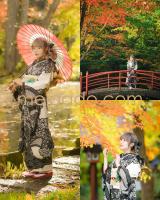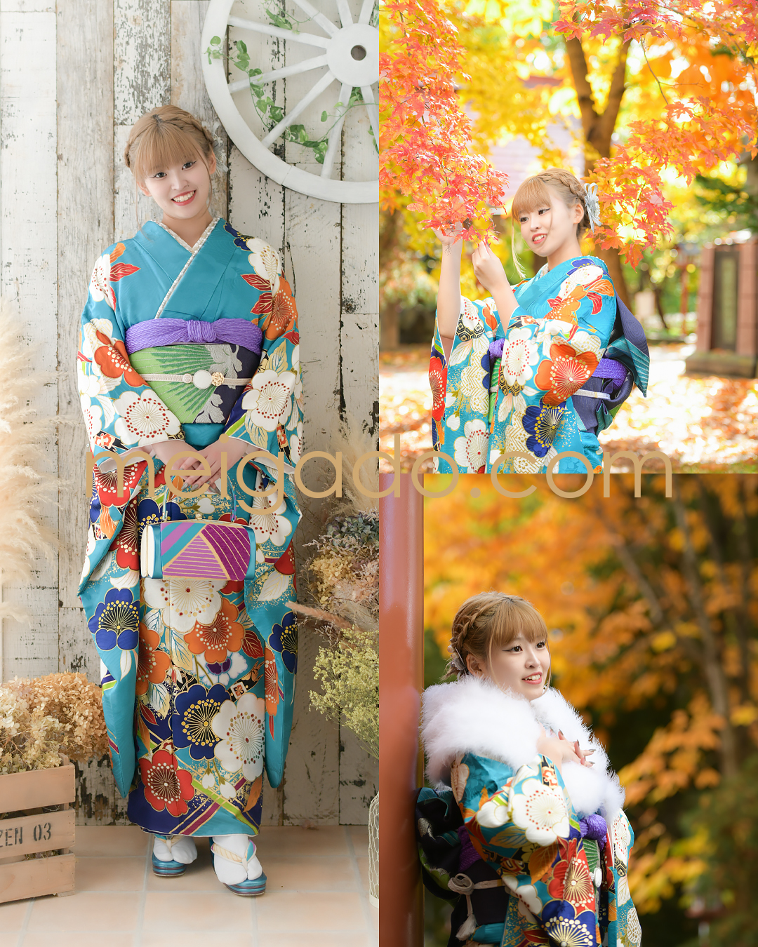 ターコイズブルーのお着物は紅葉の背景にバッチリ